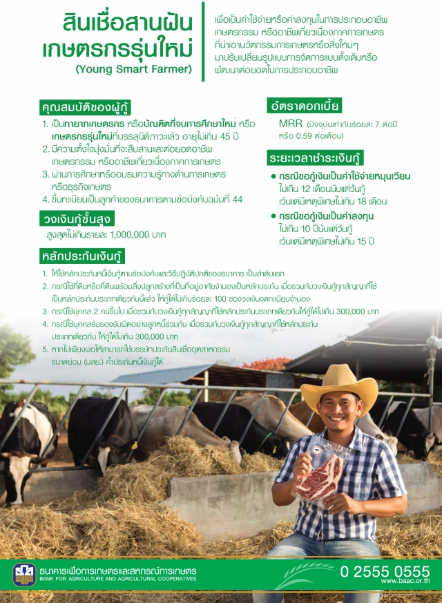 โดยธนาคารพร้อมที่จะสนับสนุนเงินกู้ให้กับกลุ่มเป้าหมายข้างต้น รายละไม่เกิน 1 ล้านบาท ด้วยอัตราดอกเบี้ย 7% ต่อปี หรือ 0.59% ต่อเดือน โดยเกษตรกรสามารถกู้เงิน เพื่อเป็นเงินทุนหมุนเวียนหรือเพื่อการลงทุน ซึ่งทางธนาคารตั้งเป้าหมาย “จ่ายเงินสินเชื่อสานฝันเกษตรกรรุ่นใหม่” วงเงิน 5,000 ล้านบาท ตลอดระยะเวลา 3 ปี