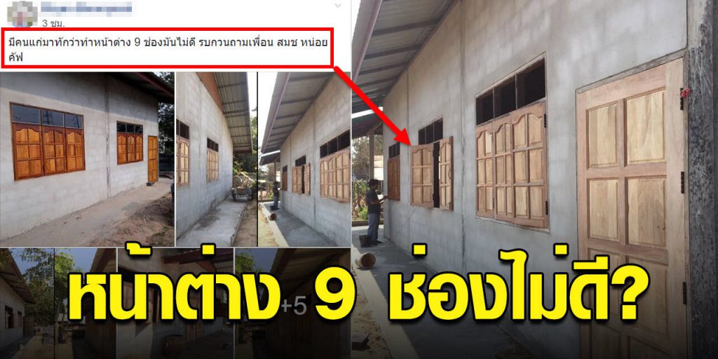 มาอีกแล้ว สร้างบ้านเกือบจะเสร็จอยู่แล้ว มีคนแก่มาทักว่าทำหน้าต่าง 9 ช่อง มันไม่ดี กลายเป็นเด็นในโลกโซเชียลที่ทำเจ้าของบ้านมีความกังวลใจเป็นอย่างมาก เมื่อผู้ใช้เฟซบุ๊คท่านหนึ่งได้ออกมาเผยแพร่ภาพหน้าต่าง 9 ช่อง บ้านของเค้าเองพร้อมข้อความระบุว่า “มีคนแก่มาทักว่าทำหน้าต่าง 9 ช่องมันไม่ดี รบกวนถามเพื่อน สมช หน่อยคัฟ”